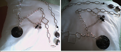 Colar com correntes largas e médias em preto e ligações em fio de algodão encerado, peças em branco e preto de resina e uma bola de vime em preto. Fecho na extremidade.
